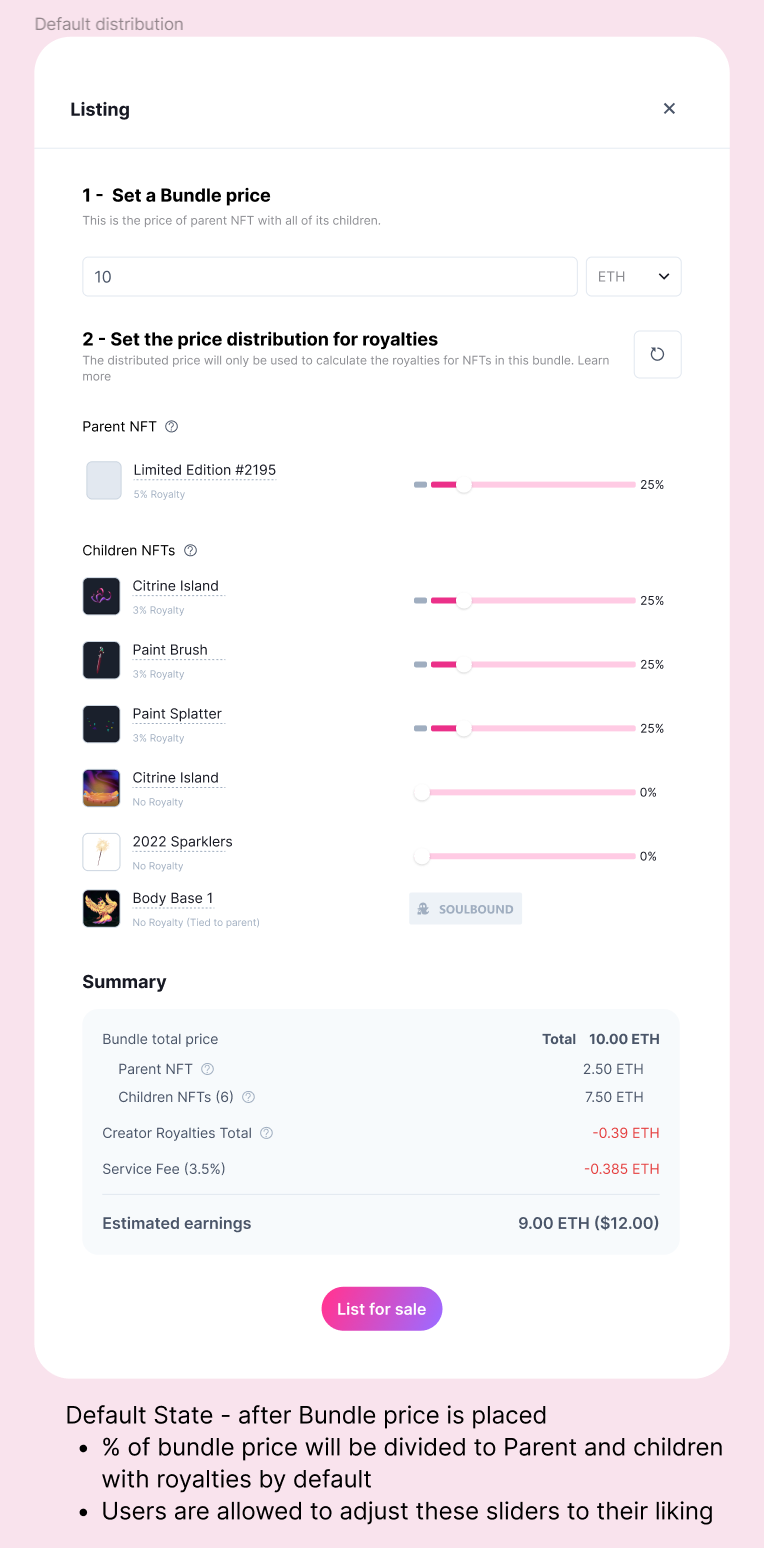 The user specifies the price of each NFT in the bundle, starting with the parent and ending with the children. The user only needs to distribute the total price among the various NFTs.